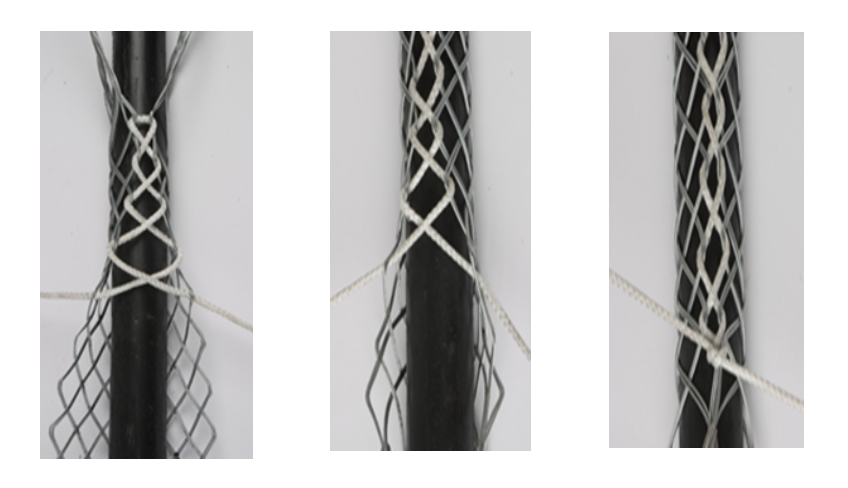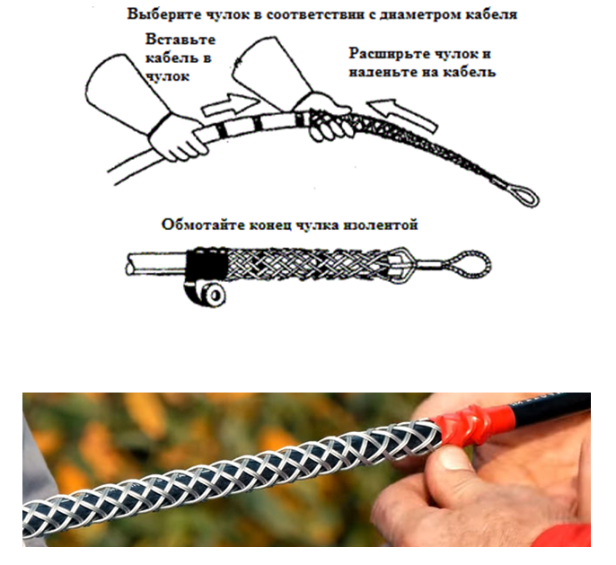Надежность фиксации кабеля зависит от правильности выбора конструкции, типоразмера и длины кабельного чулка, а так же способа первоначального сцепления кабеля с концом чулка. Для создания первоначального сцепления кабеля с чулком необходимо закрепить конец чулка (например: изолентой, веревкой, проволокой или другими материалами) в особо тяжелых случаях можно применять трубные хомуты.
